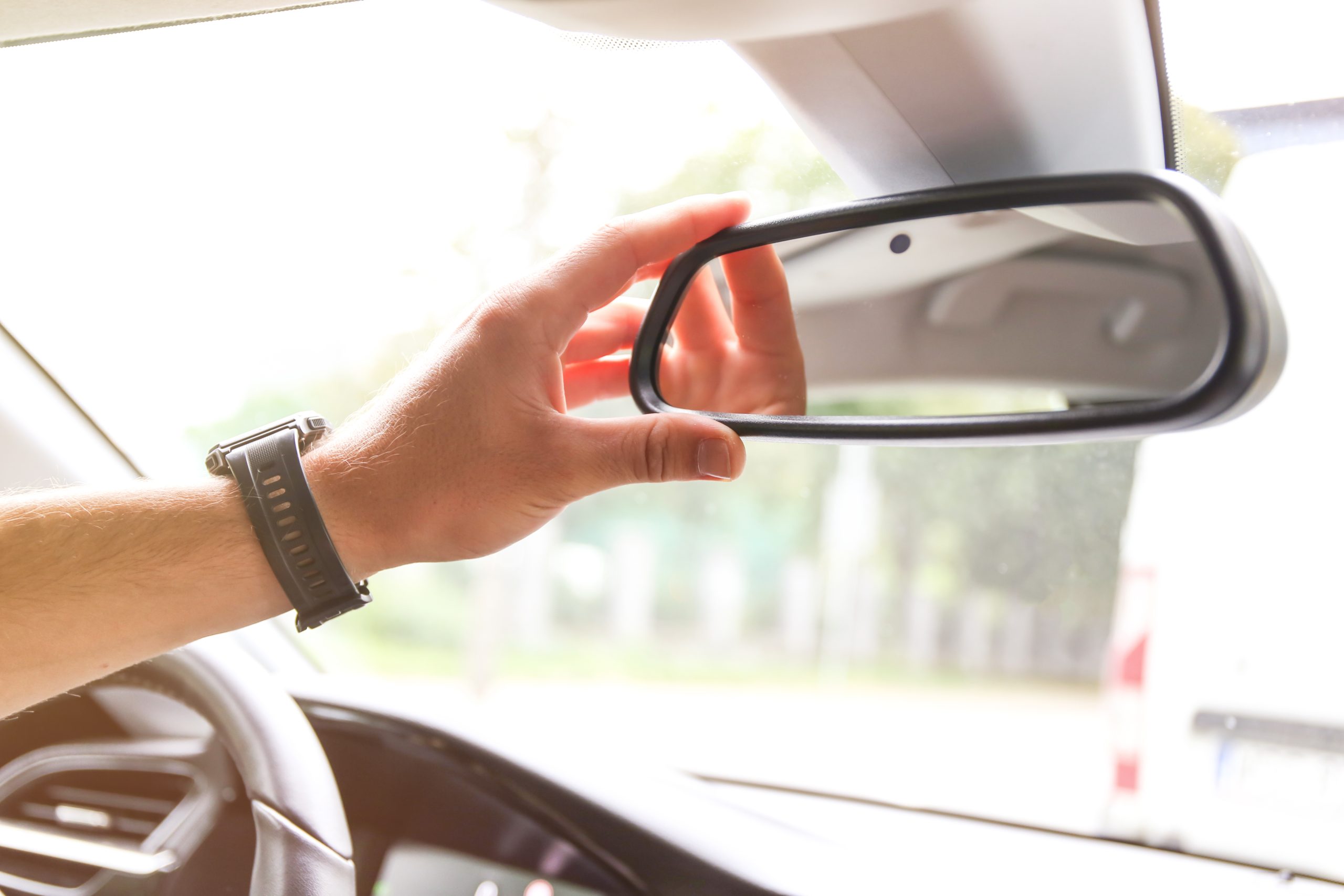 a man’s hand corrects the rearview mirror in the car. Mirror with camera and sensors